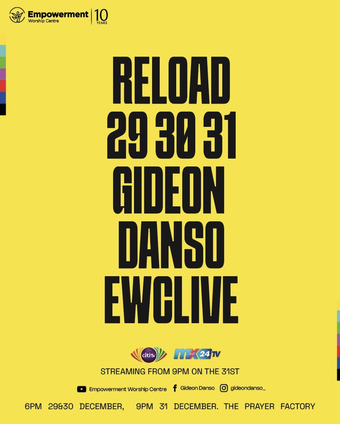 Prepare to step into the new year with renewed strength and purpose! Join us on December 29-30 at the EWC Headquarters for the Reload Conference, led by our Global Lead Pastor, Prophet Gideon Danso. This is your time to recharge, pray, and align with God’s vision for the year ahead.